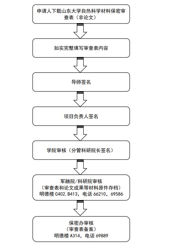3.携带申请表一式四份及需要审查的材料目录清单,分别科技创新军民融合研究院C402、科研院B413审核。